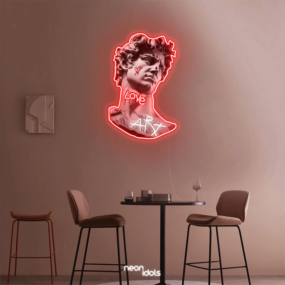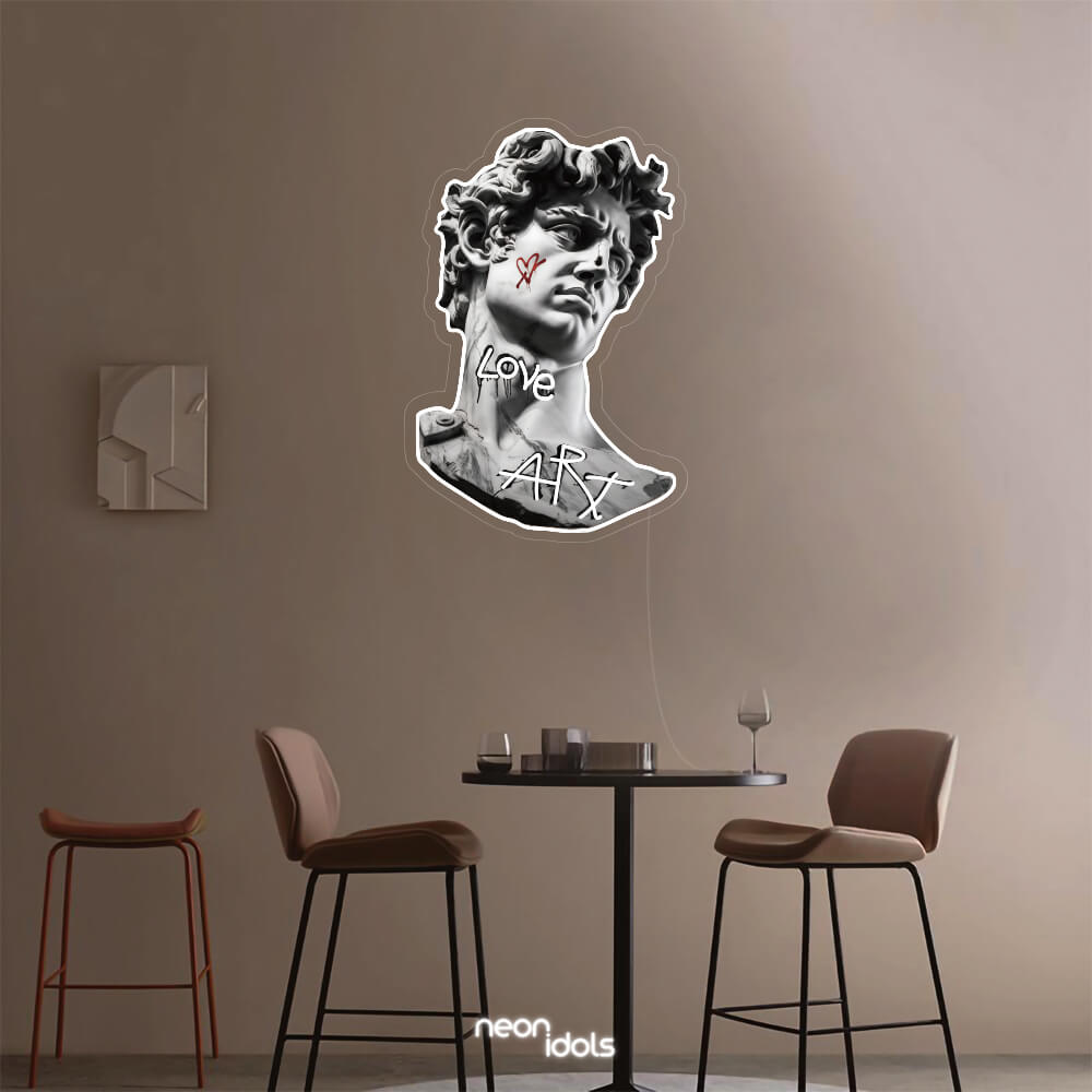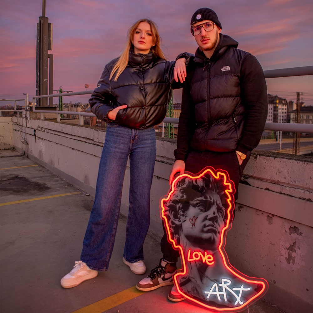 Szembetűnő neonfények: A szobor kontúrjainak és a „Love Art” feliratnak a neonfényes kiemelése különleges, dinamikus hatást ad a képnek, életre keltve az egész alkotást.